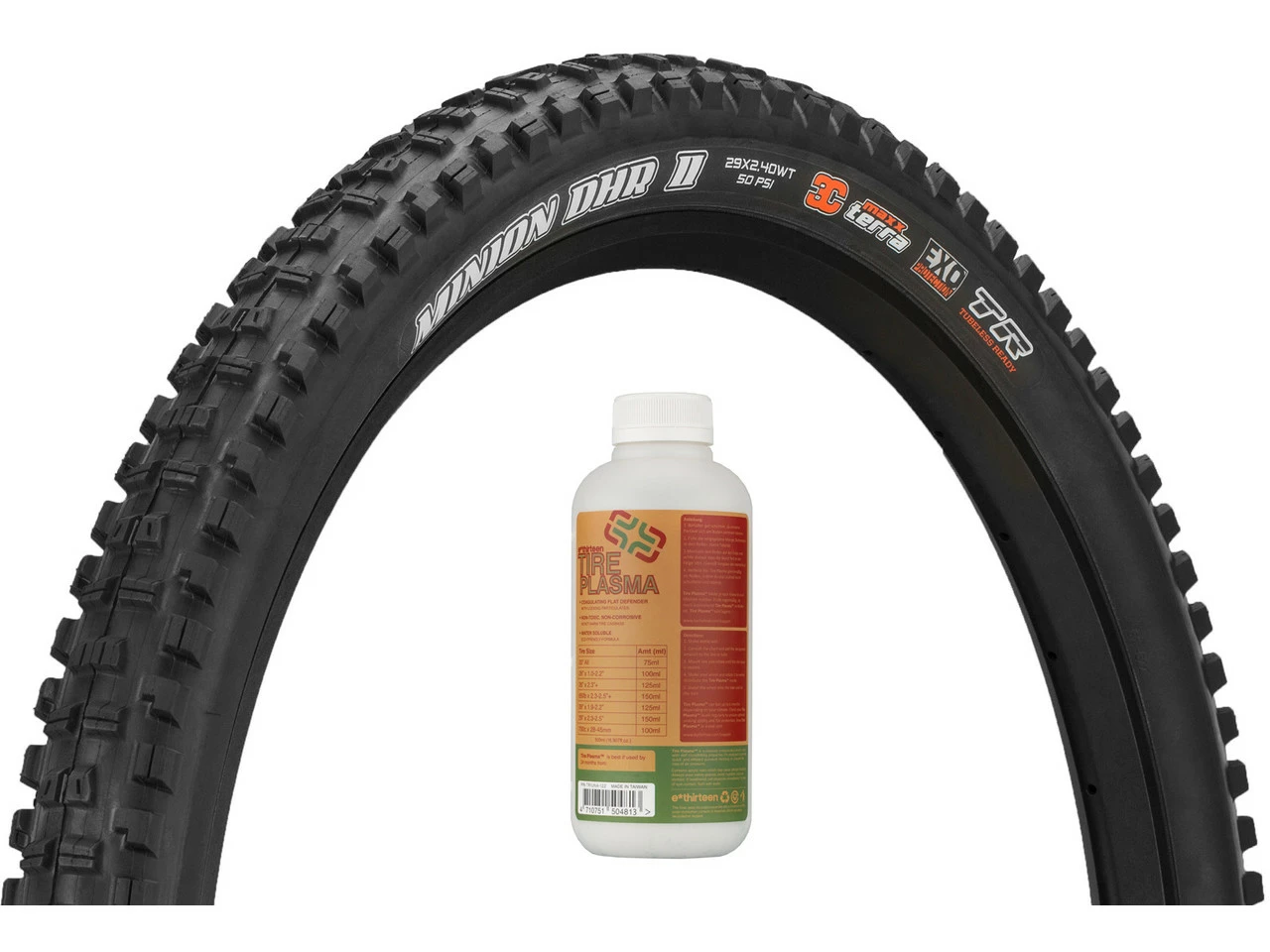 Le pneu souple Maxxis Minion DHR II 3C MaxxTerra EXO WT TR 29″ en set avec le fluide d’étanchéité e*thirteen Tire Plasma